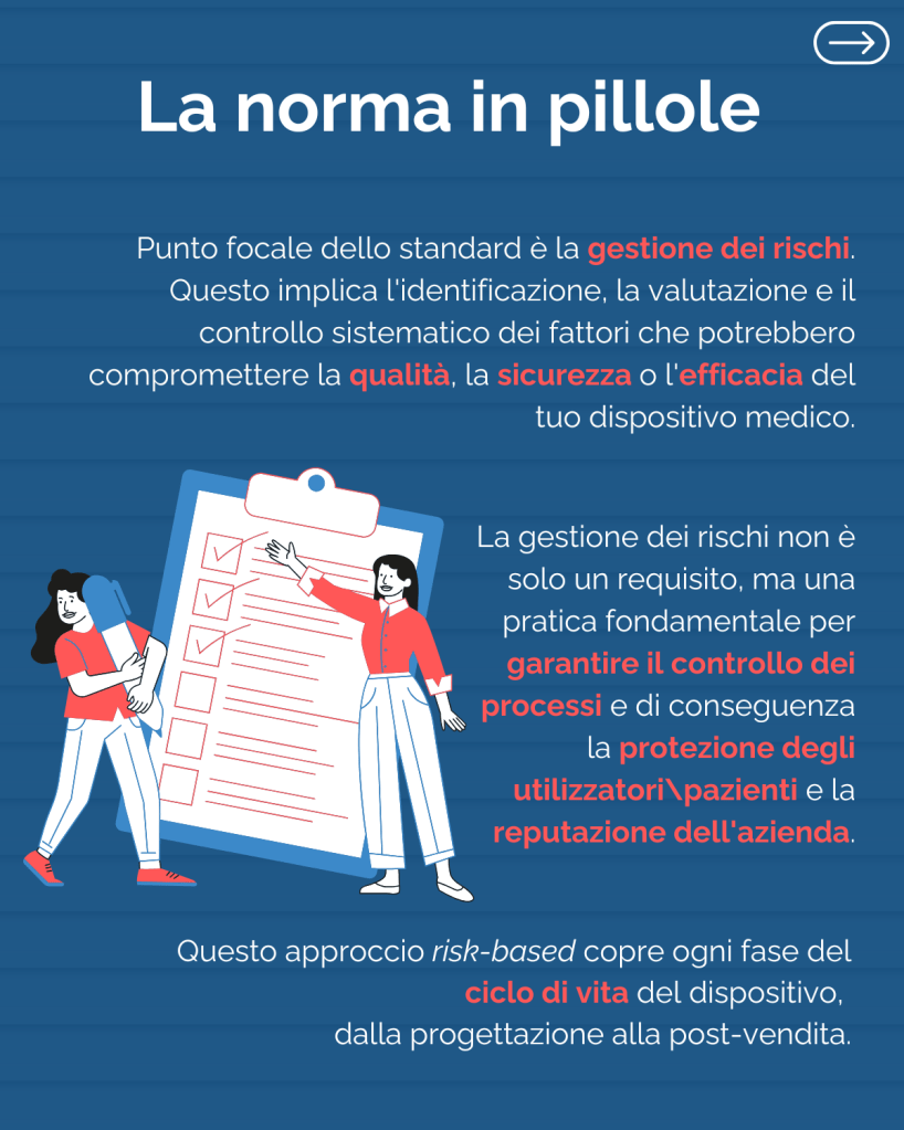 Il punto focale della norma è la gestione dei rischi. Questo approccio risk-based è essenziale per garantire il controllo dei processi e la protezione degli utilizzatori e dei pazienti.