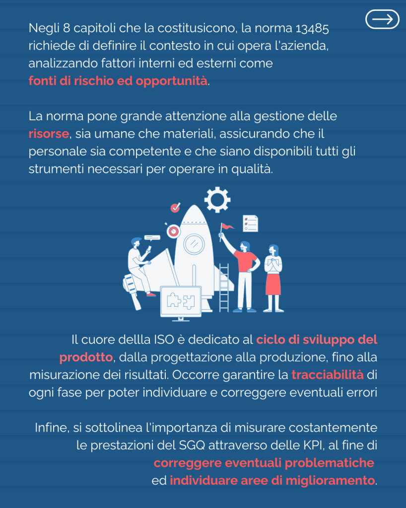 Tra le tante norme presenti, quella più adeguata per aziende che intendono fabbricare (o anche solo commercializzare) prodotti o servizi nell’ambito medicale è la ISO 13485 – Medical devices — Quality management systems — Requirements for regulatory purposes.