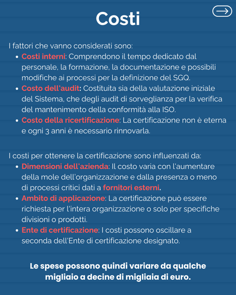 - Facilitazione del Fundraising: Gli investitori sono più propensi a finanziare aziende che dimostrano di avere processi funzionali ed efficaci e una certificazione.